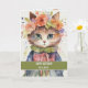 Um cartão de aniversário geral que pode ser personalizado, para qualquer idade de uma menina mais nova, isto é tão fofo com um gato de mesa com grandes olhos Cat está vestindo uma faixa floral, o texto é Feliz Aniversário, adicione nome. Dentro é um padrão floral bonito em cada lado do cartão, com um espaço para texto num quadrado branco de canto arredondado.