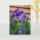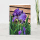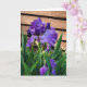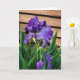Feliz Amigo de Aniversário. Bonito flores roxas. Fotografia de flores irlandesas e madeira castanha em apuros.