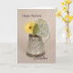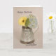 Um cartão de aniversário para a Irmã com uma margarida amarela gerber e Hydrangea azul em um jarro de estanho e um fundo desvanecido com "Parabéns" no topo e "Irmã" em roteiro no fundo.