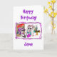 Feliz Aniversário - Jane - Cartão divertido com um desenho animado "As raparigas a comprar", um cartão branco, texto colorido e um desenho animado.