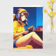 Cartão de aniversário com uma garota anime bonito vestindo fones de ouvido em amarelo.
