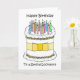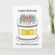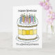 Um bolo de cartoon coberto de velas iluminadas e acompanhado das palavras "Feliz Aniversário a Artesanal Especial".