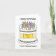 Uma imagem simples de um bolo de aniversário branco decorado com velas iluminadas e um arco amarelo amarrado à sua volta. As palavras "Feliz Aniversário para o meu companheiro de pilates" acompanham a imagem.