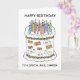 Um bolo de cartoon decodificado com envelopes nos lados e velas acesas no topo. As palavras "Parabéns a um correio especial" acompanham a imagem.