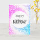 Este cartão de aniversário contém as palavras "Feliz Aniversário" na frente, com um corante de gravata rosa e azul inspirado no fundo. O dentro diz: "Espero que seu dia especial esteja cheio de todas as coisas que você ama. Feliz aniversário!"