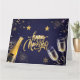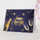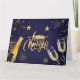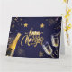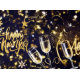 Uma cena festiva de comemoração do Ano Novo, com uma garrafa espumante de champanhe e duas flautas cheias de espumante. O fundo é um marinho azul profundo, adornado com estrelas ouros, ximando confete, e padrões circulares.
