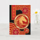 Feliz Ano Novo Chinês do Cavalo, cartão de saudação em papel com uma silhueta da cabeça de um cavalo rodeada de tons vermelhos e dourados. Os elementos do crisântemo floral e as nuvens circulares auspiciosas são apresentados em segundo plano. Uma faixa se pendura com Feliz ano novo escrito em chinês. Um símbolo caligráfico de zodíaco para cavalos também é visível. Arte, imagem e direitos de autor versos © Shoaff Ballanger Studios, 2024.