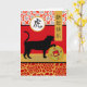 Feliz Ano Novo Chinês do Tigre, cartão de boas-vindas em papel com uma silhueta de tigre a rolar uma moeda de sorte Feng Shui pela rua. Os elementos florais estão na parte superior e inferior da placa. Um banner de ouro pende com o Feliz ano novo escrito em chinês. Também é visível um símbolo caligráfico de zodíaco para tigre. Arte, imagem e direitos de autor © Shoaff Ballanger Studios.