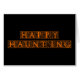 Texto ornamental "Happy Haunting" em letras laranja vibrantes, um design humorístico e sofisticado para um Halloween assombroso