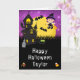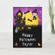 Essa carta de Dia das Bruxas divertida e assustadora pode ser personalizada com um nome ou título, como filha, neta, sobrinha, amiga etc. Ele apresenta uma bruxa bonita ao lado de uma casa assombrada. Ao fundo está uma lua de cheio com morcegos e um céu noturno roxo com estrelas. O texto combina fontes decorativas e serif para um aspecto na moda e moderno. Isto é perfeito para o Halloween.