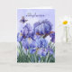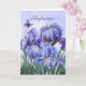 Flores de íris roxas com barba em tons de violeta e lavanda são apreciadas por lindas borboletas dançantes em um ambiente de jardim, em seguida, combinadas com uma adorável mensagem de desejos de aniversário escrita na língua espanhola. Que você receba tudo o que deseja neste dia especial é a mensagem.