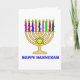 Um menorah brilhante de Hannukah com as palavras Hannukah feliz dá boas-vindas ao feriado. Comer feliz do latke!