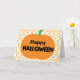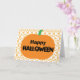 Uma abóbora feliz do Dia das Bruxas senta-se sobre um padrão personalizado de formas de giro do abstrato.