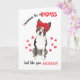 Feliz Dia de as mães Badass do seu Cartão de Cachorro Terrier de Boston com amor e afeto. Seu cachorro de Boston Terrier Dog quer ser um maldito assim como você, sua mamãe de cachorro. Ele veste uma bandana bolinhas vermelha amarrada em sua cabeça e assina óculos vermelhos como o seu. Suas estampas de pata rosa e vermelha têm forma cardíaca para um dos dedos. Dentro é uma bolinhas vermelha à esquerda e uma mensagem de aquecimento cardíaco à esquerda. Você é tão admirado, você é vibrante, forte, paciente e incrível além de ser a melhor mãe de cachorro de sempre. Todo o texto pode ser editado apenas use a opção "personalizar". Por favor, lembre-se de mudar o nome do cachorro para o nome do seu cachorro. Você encontrará mais de 30 raças como esta, com bandanas e óculos vermelhos na nossa coleção de "Cartões e Presentes do Seu Cão". Você também encontrará uma bandana vermelha, assim como a do cartão que você pode personalizar e comprar e tirar sua foto com seu cachorro de Boston Terrier! A placa de Dia de as mães mais exclusiva em um longo tempo.