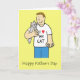 Um homem vestindo uma camiseta que diz "Eu amo meu gato" abraça um gatinho de cinza. A imagem é acompanhada das palavras "Dia de os pais feliz".
