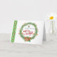 Um cartão de cartões de natal de Natal com uma coroa aquosa. Agulhas de pinheiros verdes, cones de pinho e bagas decorativas constituem esta coroa festiva. Dentro a coroa são alguns ornamentos decorativos e as palavras" podem ser Feliz e Brilho. Escrito em uma fonte vermelha da moda. Um padrão verde e vermelho com quadrados brancos ao longo da fronteira.