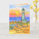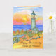 Uma carta de aniversário feliz, com um farol e uma área com o sol que se põe sobre o oceano desenhado com tinta e pintado com aquarela. É bom personalizar com os nomes do casal especial. No dentro está uma sombra coordenadora de laranja e uma mensagem que você pode editar para dizer o que você gostaria.