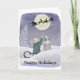 Lindo cartão Feliz Férias com um Australian Shepherd e um menino observando o Papai Noel com renas no céu.