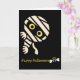 Um cartão de Halloween assustadoramente fofo com uma abelha-múmia alegre espiando para desejar um "Feliz Halloween" brilhante e zumbante! 🐝🎃