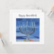 Pintura a óleo de uma menorá de Hanukkah com fundo azul.