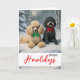 Feliz Howlidays uma bela imagem de Natal com um poodle bronzeado e um chacota preto sentado numa cena de inverno. Personalize as áreas de texto do cobrir e do interior como quiser. Cena de inverno de neve com um par de cachorros vestindo arcos vermelhos e verdes festivos. . Art, image e verse copyright Shoaff Ballanger Studios, 2024.