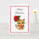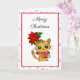 Gato de laranja bonito com Poinsettia vestindo mitenes bonitinhos Feliz Cartão de Natal.