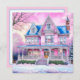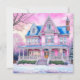 Um bonito cartão de Natal com uma casa vitoriana cor-de-rosa, um jardim de neve e uma saudação quente.