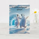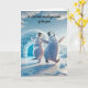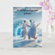 Dois pinguins parecem estar dançando alegremente em frente a um iglu sob um céu claro e ensolarado Texto pode ser mudado.
