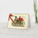 Cartão postal com natais vintages com ilustração de trenó, fita e holly.