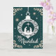 This card shows a peaceful and classy tribute to Christmas. In the middle, there's a stunning white ornament hanging against a deep teal background. Inside the ornament, you can see a nativity scene with Joseph, Mary, and baby Jesus under the Star of Bethlehem. The scene is detailed but simple, telling a spiritual story clearly. Around them, there are sparkling stars in white and gold, creating a magical nighttime feel. Cream-colored designs decorate the corners, adding a touch of elegance.