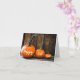 Este cartão rústico de Feliz Outono para Todos tem três abóboras laranja sentadas em frente a uma parede de madeira marrom escura. Você também pode aumentar o tamanho do cartão para 5x7 ou um tamanho maior.