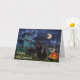 Cena assustadora com dois gatos pretos em frente a uma casa assombrada com fantasmas, morcegos, uma abóbora e uma bruxa voando sobre uma vassoura através de uma lua de cheio. Texto "Feliz Dia das Bruxas".