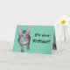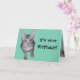 Um gato ama um cartão de aniversário com um desenho de um gatinho dizendo "É seu aniversário!" com o dentro que diz: "Tenha um dia perfeito! " Uma capa do gatinho também é exibida no canto dentro.