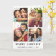Cartão de saudação dobrado de Natal moderno, com uma colagem de 4 fotos, "Feliz e Brilho" em tipografia elegante, nome da família e ano. Na dentro, personalize sua saudação e seus primeiros nomes em uma simples tipografia.