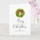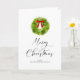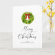 Cartão de Natal Elegante com ilustração aquosa de uma coroa de feriado com um arco vermelho. A letra do roteiro abaixo diz "Feliz Natal".