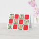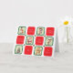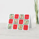 As imagens tematizadas do Natal bonito em quadrados verdes individuais alternando com quadrados vermelhos que cada um tem diferentes desejos de feriado. As imagens são um boneco de neve, uma estocação listrada de cana doce, um Papai Noel, uma rena, uma árvore de Natal decorada e um biscoito de homem de gengibre. Todos os desejos de feriado podem ser facilmente alterados para qualquer saudação que você preferir. O texto no dentro também pode ser facilmente alterado ou excluído se você quiser escrever manualmente sua mensagem.