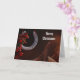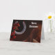Cartão de Natal com uma fotografia com ferradura enforcada adornada, enfeitada com uma fita de xadrez de búfalo e decorações de Natal. O topo de uma cabeça e ouvidos de cavalos também em vista.
