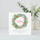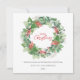 Uma bela coroa aquática da Terra de Natal, com folhas verdes, eucalipto, groselha e amoras-fritas, com as palavras Feliz Natal em tipografia vermelha elegante. Personalize com seus próprios detalhes.