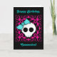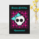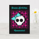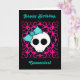 Um cartão de aniversário de gótico com um fundo preto e fuschia e um crânio com um arco azul. O texto é personalizável. Excelente para garotas adolescentes e adolescentes.