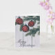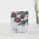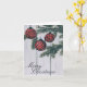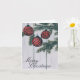 Um cartão elegantemente desenhado de ornamentos ruidosos e vermelhos decorando uma árvore com fundo branco. Artesanato original pintado à mão em aquarela.