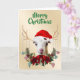 Cabra linda de LaMancha com seu chapéu de Papai Noel e galhadas adornada com Enfeites de natal listrados, cercada por uma coroa de natal de poinsetos vermelhos, cones de pínus, verde e um grande arco vermelho. - Arte original ©goatLady GetYerGoat™