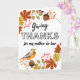 Dando Obrigados, cartão de cumprimentos de Ação de Graças para uma sogra. Texto personalizado na frente do cartão para que você possa alterar o texto na terceira linha. Personalize o interior como quiser. Design circular com o tema do outono com uma variedade de folhas, bolotas, bagas e uma ave. Arte, imagem e direitos de autor versos © Shoaff Ballanger Studios, 2022.