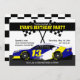 Este convite de aniversário de carro de corrida vem com uma faixa que mostra o nome que a festa de aniversário é. Abaixo da faixa estão correndo bandeiras. Os detalhes da festa de aniversário estão perto do centro do convite acima do carro. As informações de contato para RSVP estão na parte inferior.