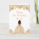 Este cartão de aniversário apresenta flores florais de creme de pêssego, falso brilho, e uma bela princesa com pele escura e um vestido elegante. Isto é perfeito para uma festa de aniversário.