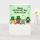 Designed with four friendly cartoon animals along the bottom—an orange cat, a brown dog, a small grey pet with a green bow tie, and a tan-faced companion with a snouty grin—this St. Patrick’s Day scene feels like a close-knit group leaning in together. Each one wears a green top hat with a gold buckle, and their wide eyes and open smiles suggest the kind of easy affection you’d share with a sister-in-law. They peek over a white banner that stretches across the lower portion, creating a cozy “we’re in this together” moment. The background fades from deeper green at the top to lighter green below, sprinkled with small clover shapes that drift around like confetti ☘️. Near the top, the message “Happy St. Patrick’s Day, Sister-in-Law” sits centered in dark green letters, standing out clearly against the pale green backdrop 💚. The orange cat gives a wink while the brown dog pants happily, adding a teasing, friendly energy between the characters. The grey pet’s bow tie pops in bright green, and the hats line up neatly as the white banner runs straight across the bottom edge.