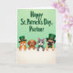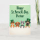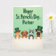 Designed with four cartoon-style pets leaning over a white fence, this St. Patrick’s Day illustration centers on two cats and two dogs whose close spacing and gentle smiles suggest easy friendship and a touch of romance. An orange cat on the left wears a green top hat and looks out with bright, amused eyes, while a brown puppy beside it grins as if sharing an inside joke. A smooth grey cat nearby sports a green bow tie and holds a calm, affectionate expression, and a fawn-colored dog completes the group in a matching green top hat and bow tie, gazing forward with a soft, welcoming look. Across the top, the phrase “Happy St. Patrick’s Day, Partner,” appears in large emerald-green lettering, stretching wide and centered above the characters. The background fades through light spring greens, letting the green accessories and message stand out 💚. Small highlights on their eyes and noses add a tender, friendly sparkle, and the fence edge stays bright white for contrast ☘️. The green top hats and bow ties repeat across the four animals against the pale green gradient backdrop.