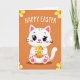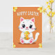 This card shows a stylized white cat with faint gray stripes, round glossy black eyes, and rosy pink touches on the cheeks, ears, and paw pads, posed front and center as if leaning in for a gentle cuddle. The cat’s paws cradle a shiny golden egg, and the careful way it holds it suggests a sweet, friend-to-friend kind of affection. The egg is decorated with tiny flower shapes and confetti-like dots in blue, red, and white, adding a festive spring feel 🌷. Above the character, rounded white lettering sits near the top, standing out clearly against the background. Behind everything is a smooth orange gradient that shifts softly in tone, keeping the scene warm and cozy without looking busy. Two simple five-petaled yellow flowers frame the layout on a diagonal, giving the cat and egg a little stage to shine 🐰. A small yellow flower rests in the upper left corner, while another matches it in the lower right corner.