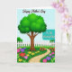 Designed with a sunny garden scene, the card features a broad, branching tree with dense emerald leaves and a sturdy brown trunk anchoring the lower area. A winding stone path of irregular warm-beige pavers starts near the lower right and leads the eye inward, like a gentle walk two friends might take side by side ❤️. Thick green grass surrounds the path, and clusters of stylized flowers in fuchsia, violet, scarlet, and yellow fill the foreground with a soft, affectionate energy 🌼. A crisp white picket fence runs across the middle, separating the flower beds from rounded green bushes under a clear blue sky. A small bright-blue bird with an orange beak perches on the fence, adding a light, companionable touch. The main message appears in flowing lettering near the upper portion, while a teal plaque-style shape nearby holds smaller words in white. The teal plaque sits toward the right side above the fence line, framed by blossoms and leafy greenery.
