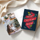 Característica dobrada elegante dos cartões de natal "nós desejamos-lhe tipografia indicada por letras disponivel do Feliz Natal" em uma fita vermelha da aguarela acentuada com folhas verdes e as bagas brancas. Personalize com seu nome de família e o ano no branco em um fundo dos azuis marinhos, e personalize o interior com três fotos e uma mensagem pre-impressa costume.