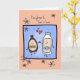 Este cartão bonito do aniversário para seus filha e filho na lei caracteriza uma ilustração lunática dos desenhos animados de uma garrafa do xarope de chocolate e de um jarro de leite que guardaram as mãos em um fundo azul das bolinhas com corações vermelhos e as margaridas brancas moldados dentro de um fundo do pêssego.